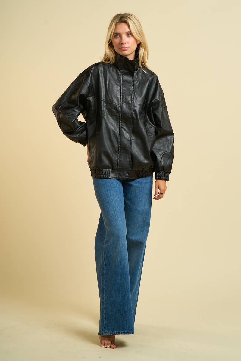 Elevate your outerwear game with this oversized faux leather jacket designed for both style and comfort. Featuring a high snap collar, full front zip, and relaxed silhouette, this jacket is the perfect throw-on piece for a bold, laid-back look. Elasticized cuffs and hem add structure, while side pockets keep it practical for everyday wear.