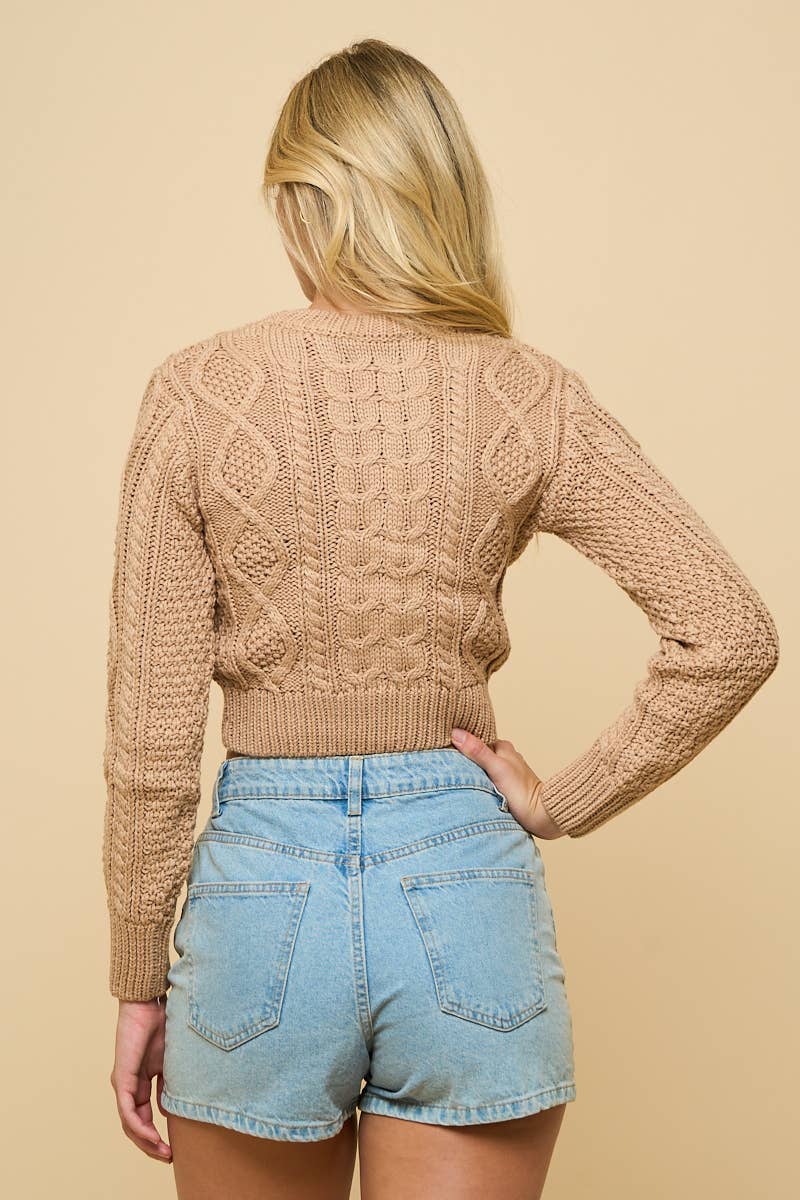 This ANWND Black Cropped Cable Knit Sweater in size Large is a stylish and versatile addition to any wardrobe. This long-sleeve cropped sweater is perfect for casual occasions during the winter and fall seasons. The pullover style and weathered black color make it easy to pair with a variety of outfits. Sweater is 15.5in in length.