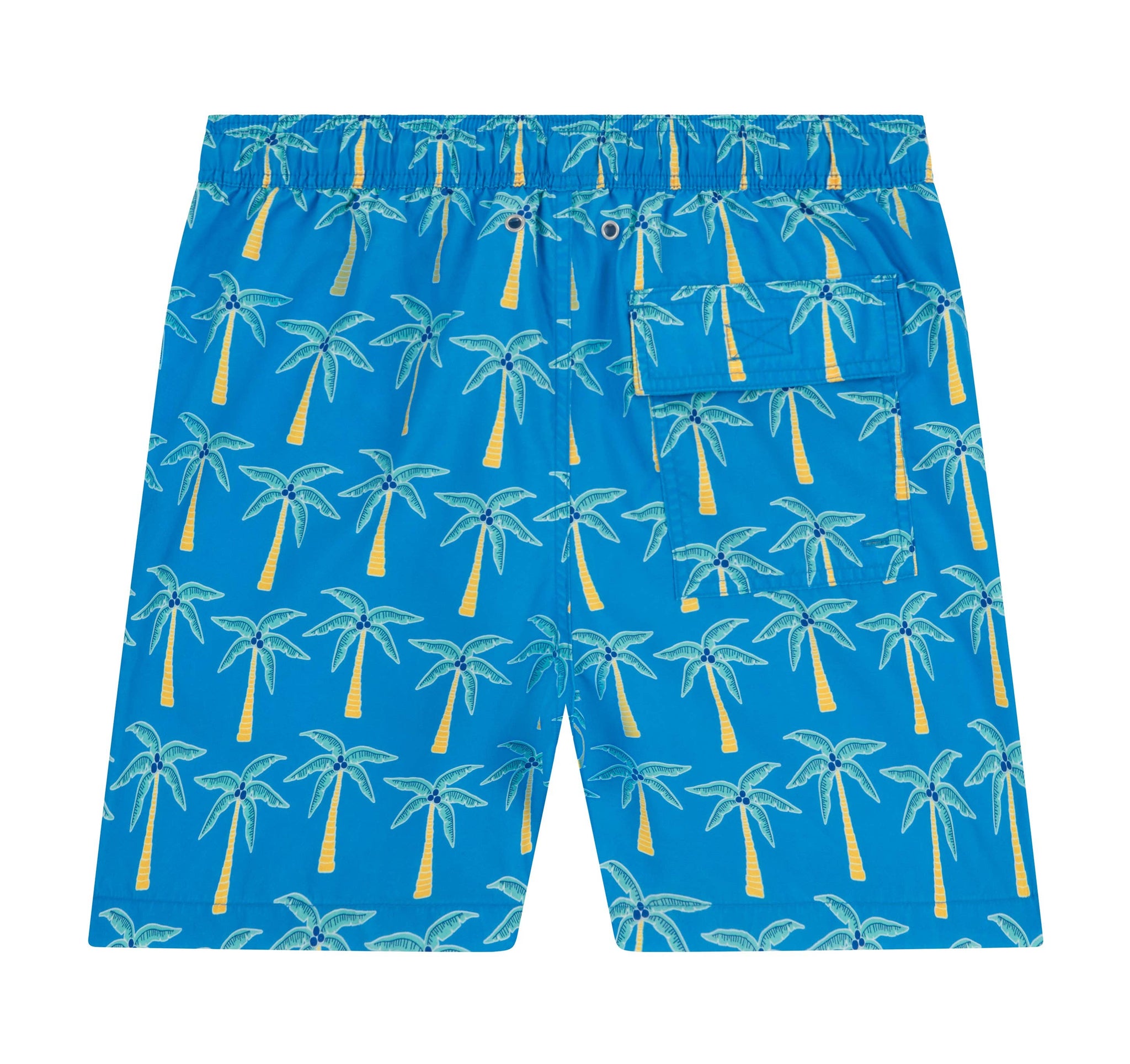 Classic palms meet bold beach style in our Blue & Green Palm swim shorts. Designed for ultimate comfort, these trunks feature a vibrant palm tree print in fresh green and golden yellow, set against a striking ocean-blue backdrop. The soft, quick-dry fabric and elasticated waistband with a contrasting green drawcord ensure a perfect fit for all-day wear—whether you're hitting the waves or unwinding by the pool.