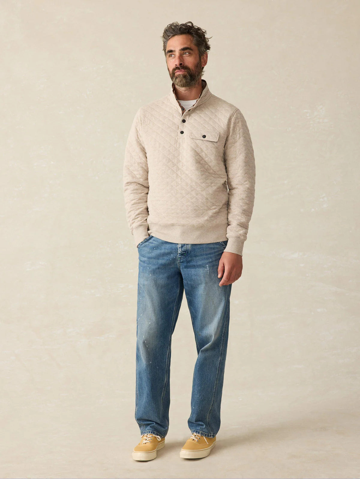 Quilted with three layers for structure, texture and warmth, this midweight fleece is more polished than a sweatshirt and endlessly versatile. We wear it over shirts or under jackets on colder days.