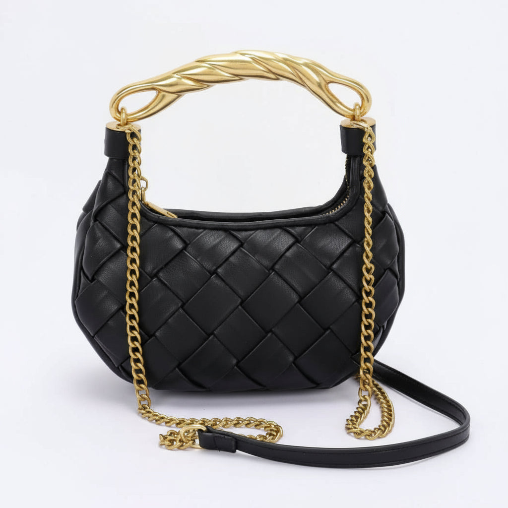 Faux Leather Braided Metal Handle Bag. This is perfect for the fashion-forward individual who appreciates quality and design. Whether you're heading to brunch or a casual outing, this handbag will complement your look while keeping your essentials close at hand.