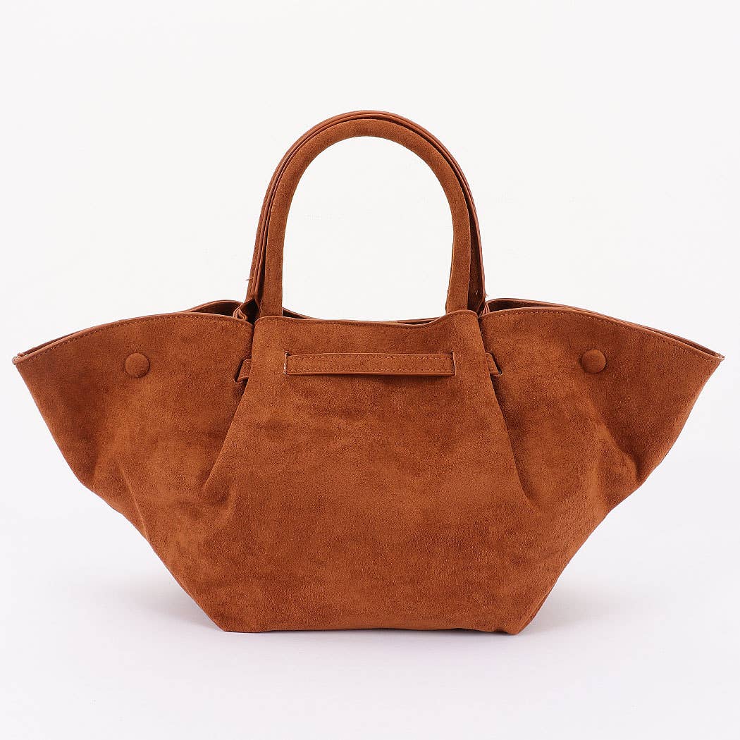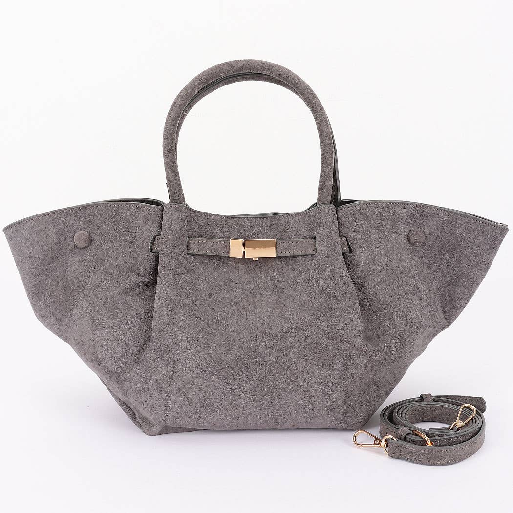 This is a stylish handbag with a unique, flared silhouette. It has a top handle and a detachable shoulder strap. The front features a metal clasp. Crafted from a soft, textured material, it offers both elegance and functionality.