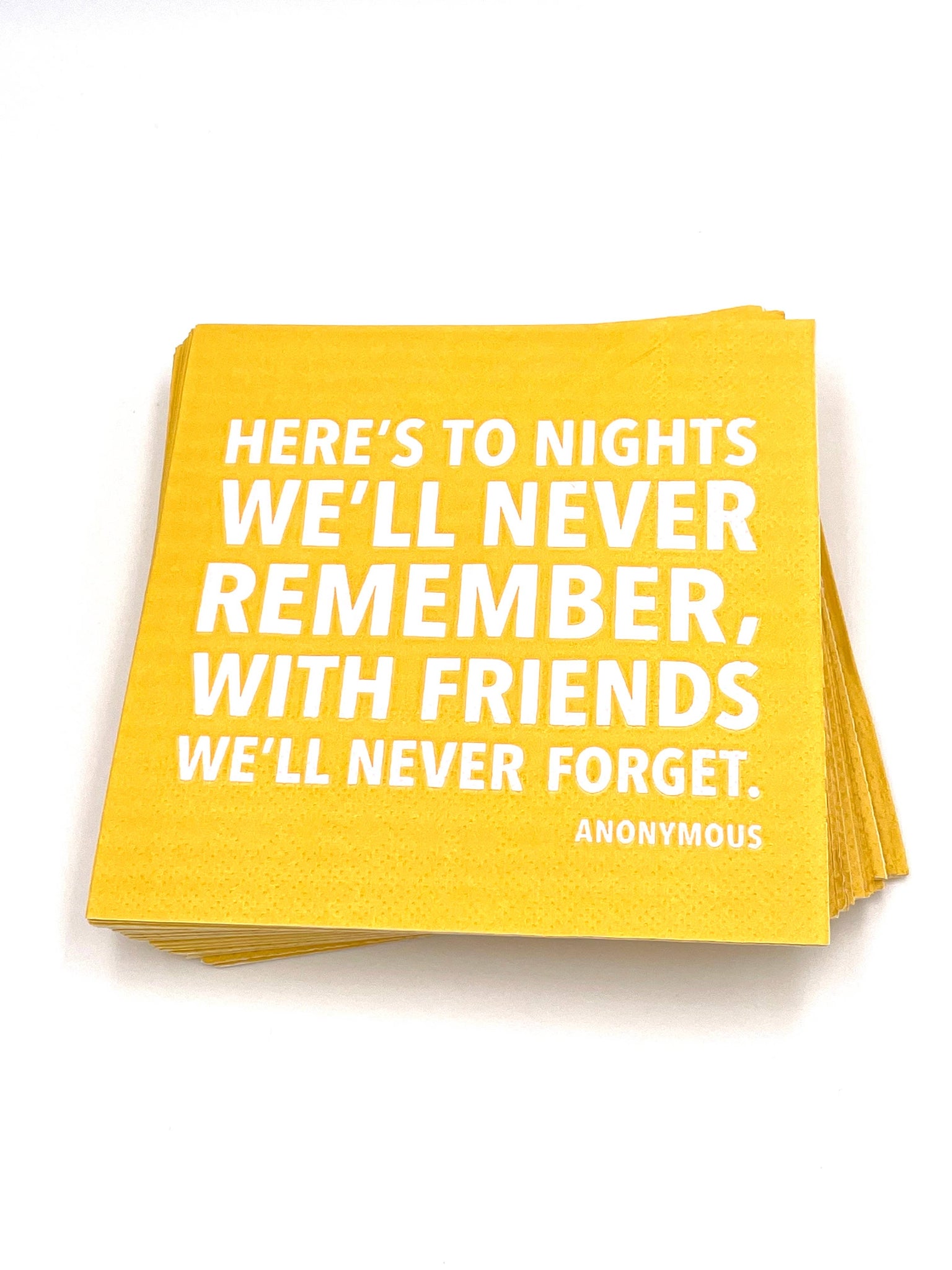 Here's To Nights We'll Never Remember With Friends We'll Never Forget 20 ct 3 ply These colorful party themed funny paper cocktail napkins are perfect for tabletop decoration.