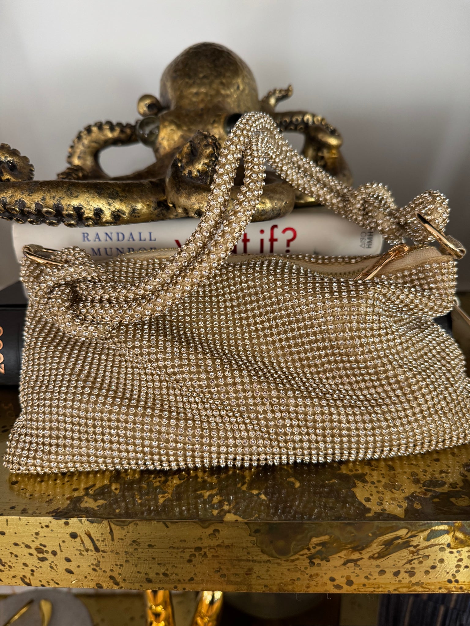 Bedecked in rhinestones, this slouchy clutch oozes effortless luxury.