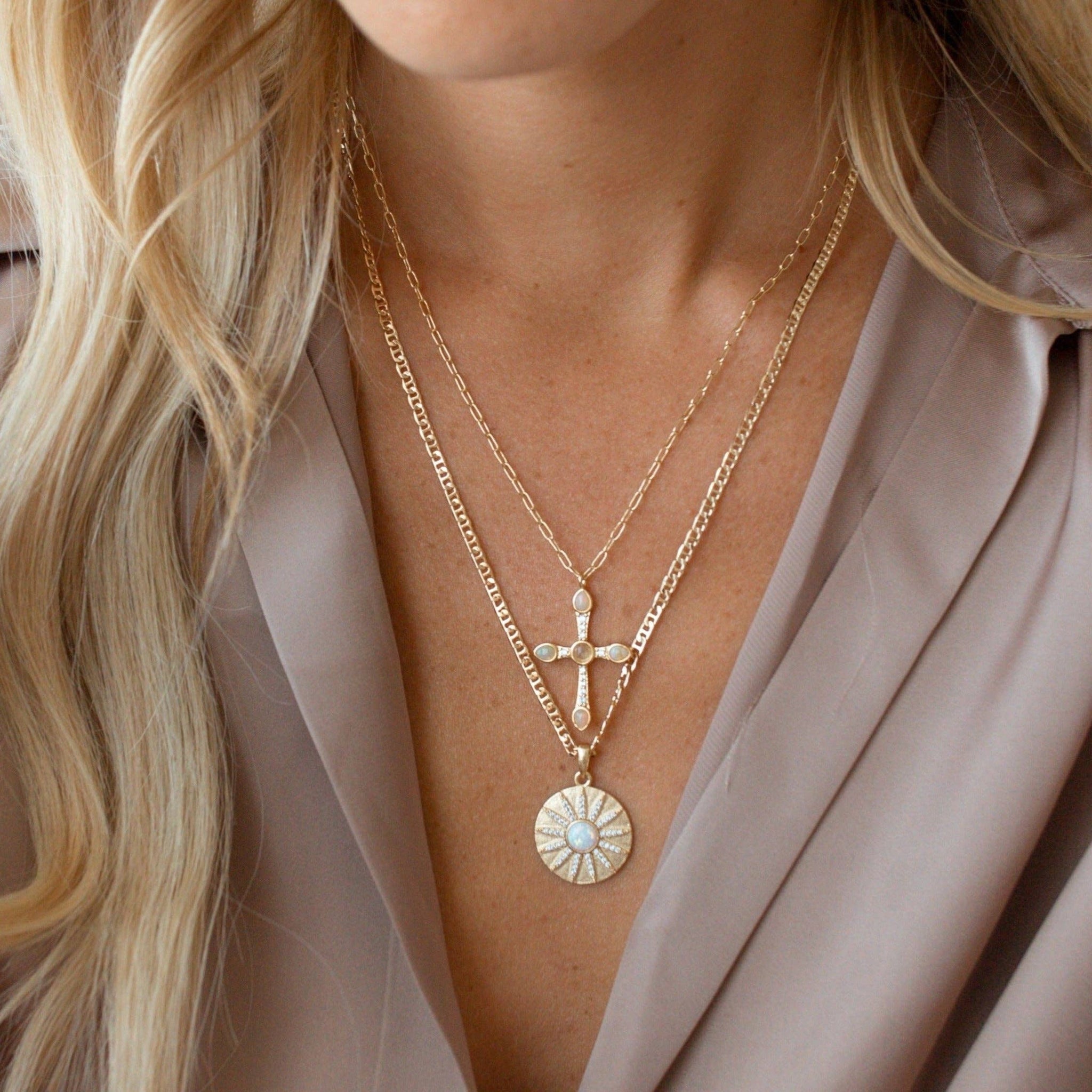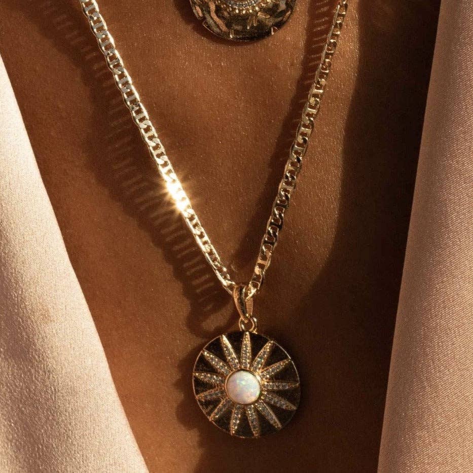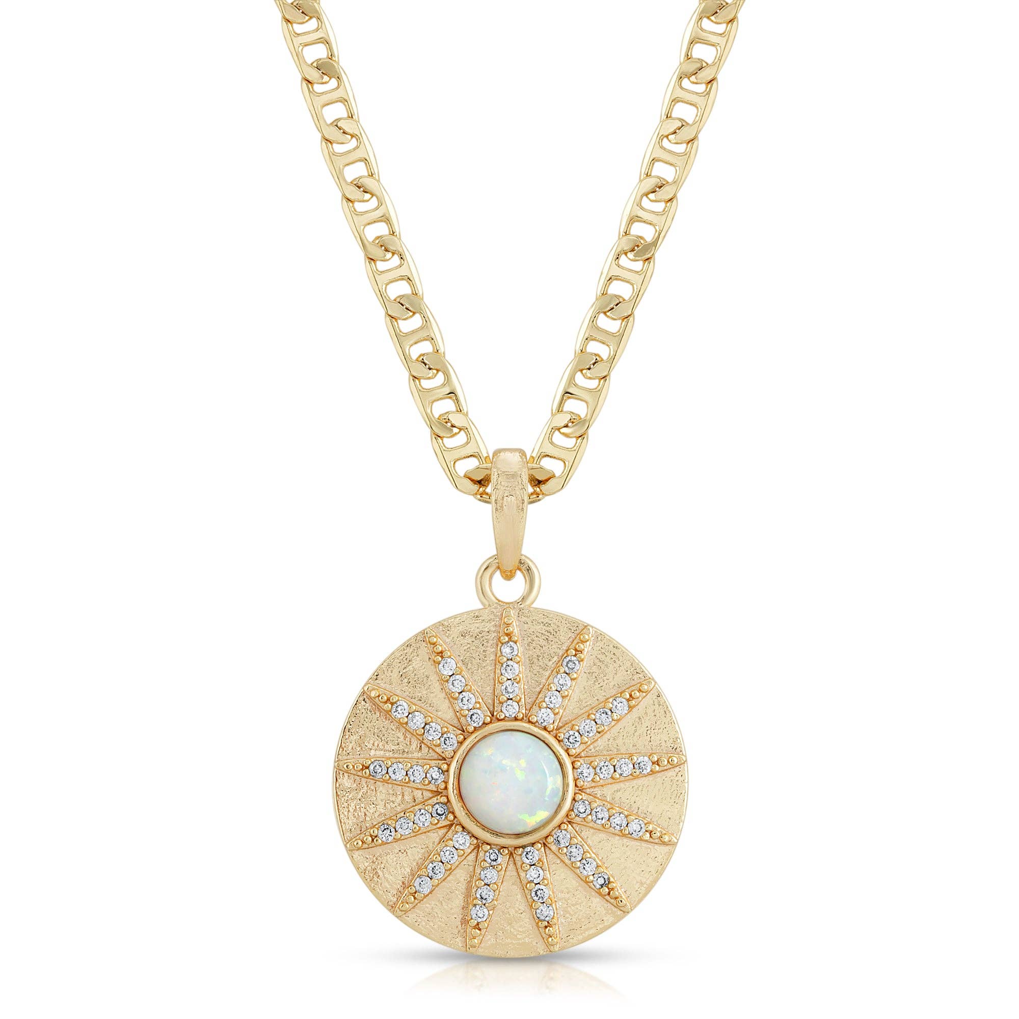 This one's for the goddesses. The Stargazer Necklace features a shimmering gold sunburst pendant with a fiery opal center surrounded by sparkling CZs. This piece was made to reflect the sunlight on summer days, and to remind you of those days when the weather won't cooperate.
